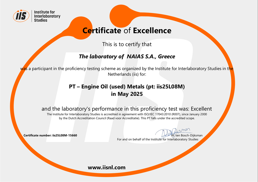 Proud Moment - Our lab in Greece, NAIAS S.A., has successfully achieved PT-iis25L08M Certification for metal analysis in used engine oil - a benchmark of analytical excellence!